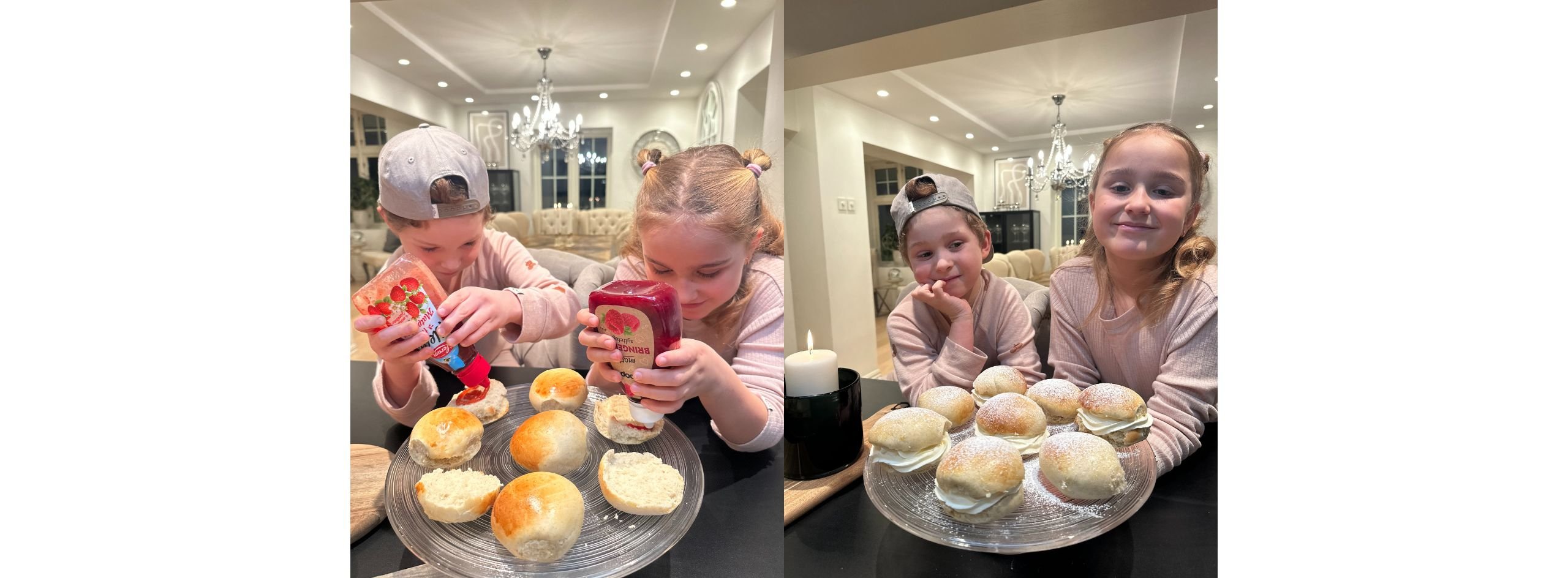 - Avkjøl, del i to og full med syltetøy og krem