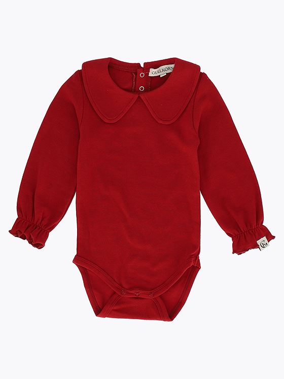 En superfin og myk body til de aller minste, med skjønn krage og detaljer på ermer. Passer perfekt til finere anledninger, eller til hverdagsbruk. Bodyen har trykknapper bak i nakken og bunn. Er enkel å ta av og på, med mye plass til hodet. Bomullskvaliteten er lett, puster godt og har kjempegod stretch, noe som gjør den behagelig til både lek, og i de små pausene. Denne kvaliteten holder seg godt, vask etter vask, og kan gjerne arves mellom venner og søsken!