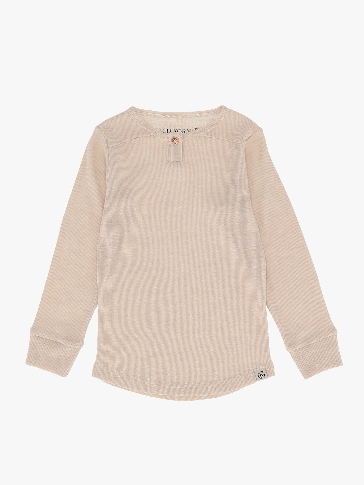 Denne ulltrøyen er i et herlig ribbestrikket materiale, som vil oppleves mykt, behagelig og pustende. Den ribbestrikkede kvaliteten gir god stretch og super holdbarhet vask etter vask. Søt treknapp i front.